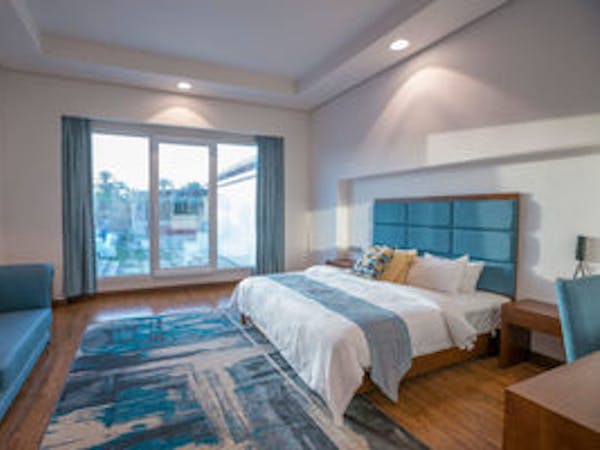This holiday Villa sleeps 6 people (Master Room with King bed, 1 Rooms with 2 single beds and 2 comfortable sofa beds at the living rooms). The villa has a large main living/dining room (9x7m), and another living room called “Arabic Majlis” (7x4m). Both living rooms have wonderful view at the garden and the pool. There are total of 4 bathrooms at this villa, 3 full bathrooms (with shower) for the bedrooms and the Arabic Majlis, and an extra half bathroom for the main living room. Daily clinging service, towels and bathroom accessories are provided. Our kitchens are fully equipped. They come with microwave, oven, stove, dishwasher, kettle, toaster, Refrigerator and all necessary cooking and serving appliances. The Villa also had a dedicated Laundry room with drier and iron table. 2 large wide screen TVs (60″) with central satellite system is made available at the living rooms. Phone system connecting rooms to each other’s and to the Reception is also available. The total built-up area of this villa is 250m2.